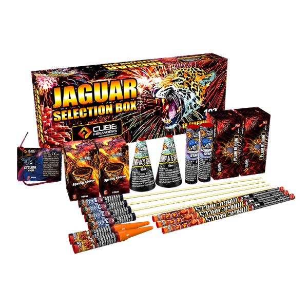 Jaguar with 18 Fireworks: 8 Fountains, 4 Rockets, 3 Roman Candles, 1 Wheel, 2 Shot Tubes.