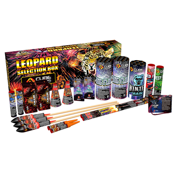 Leopard with 21 Fireworks: 11 Fountains, 3 Rockets, 2 Roman Candles, 1 Wheel, 2 Shot Tubes.