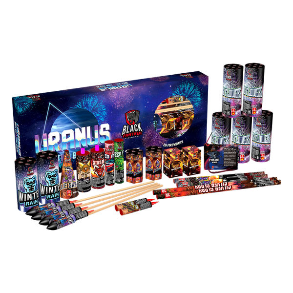 Uranus with 26 Fireworks: 9 Fountains, 4 Rockets, 4 Roman Candles, 1 Wheel, 4 shot tubes, 2 cakes, 2 mines.